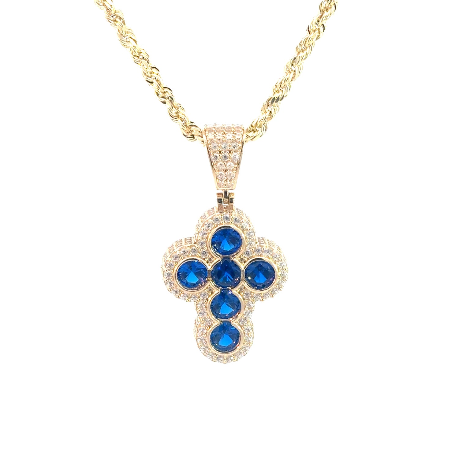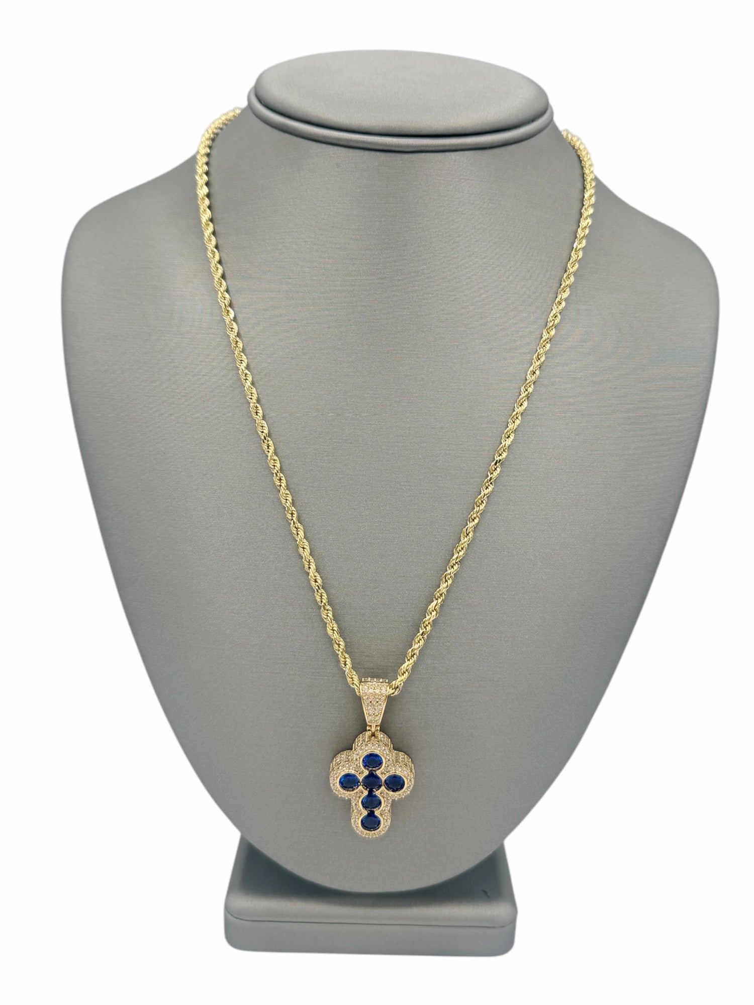 New 14K CZ Blue Cross Pendant & Semi Solid Rope Chain Made of Real 14K Yellow Gold, 100% Guaranteed Gold. Buy with Confidence from H.J™️
