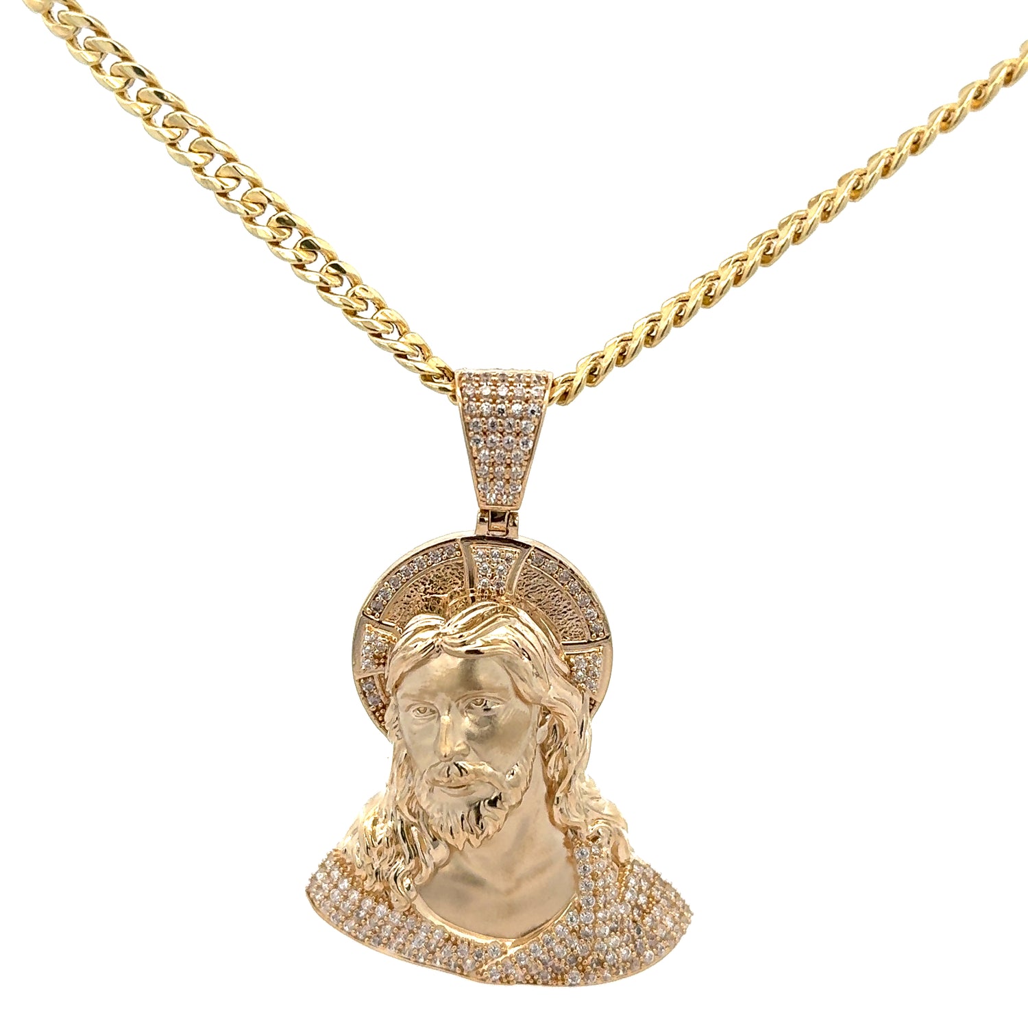 New 14K CZ Jesus Face Pendant & Semi Solid Miami Cuban Chain Made Of Real 14K Yellow Gold, 100% gold. Buy with confidence from H.J™️